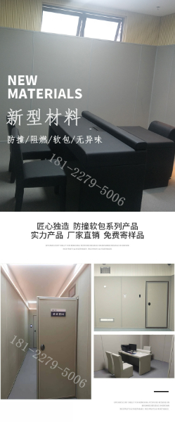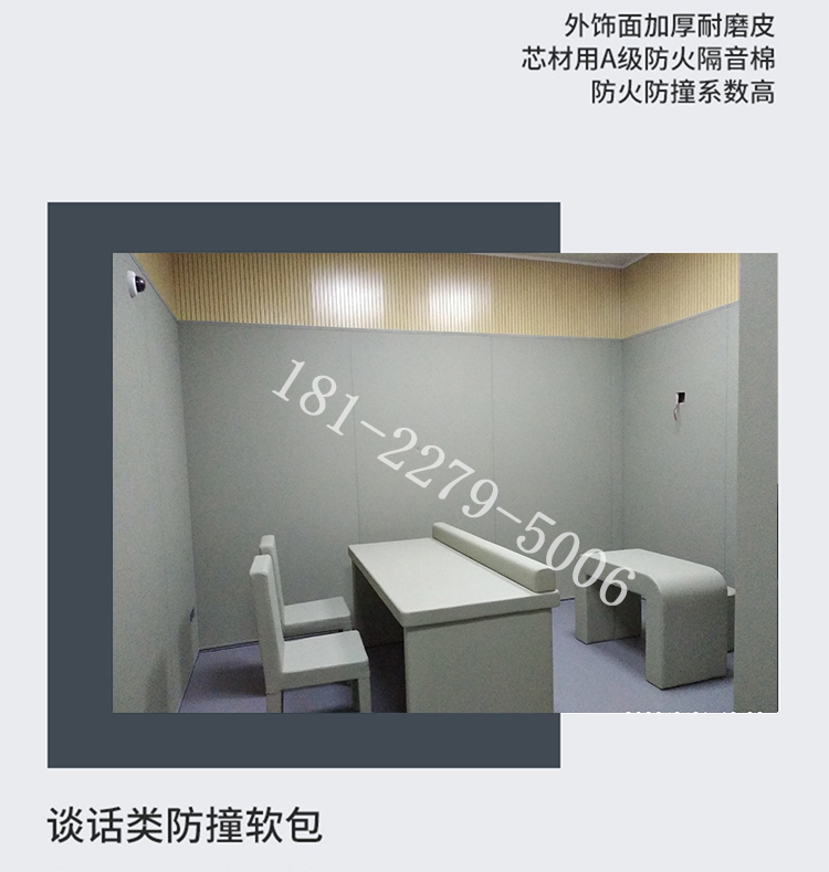 審訊室防撞軟包,是一種獨特的阻燃防撞材料,兼具阻燃、環保、防水、防撞四大特點,目前還廣泛應用在紀檢委、派出所、看守所、監獄、拘留所、談話室、留置室、詢問室、辨認室、辦案區、衛生間等機關場所。具有阻燃、環保、防水、防撞+吸音板安裝可以達到吸音效果。